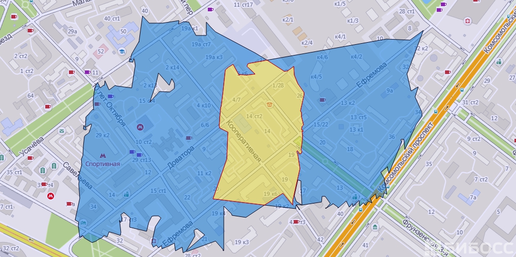 Расчет различных показателей внутри зон и на их пересечениях, а также выстраивание простого радиуса и с естественными барьерами.